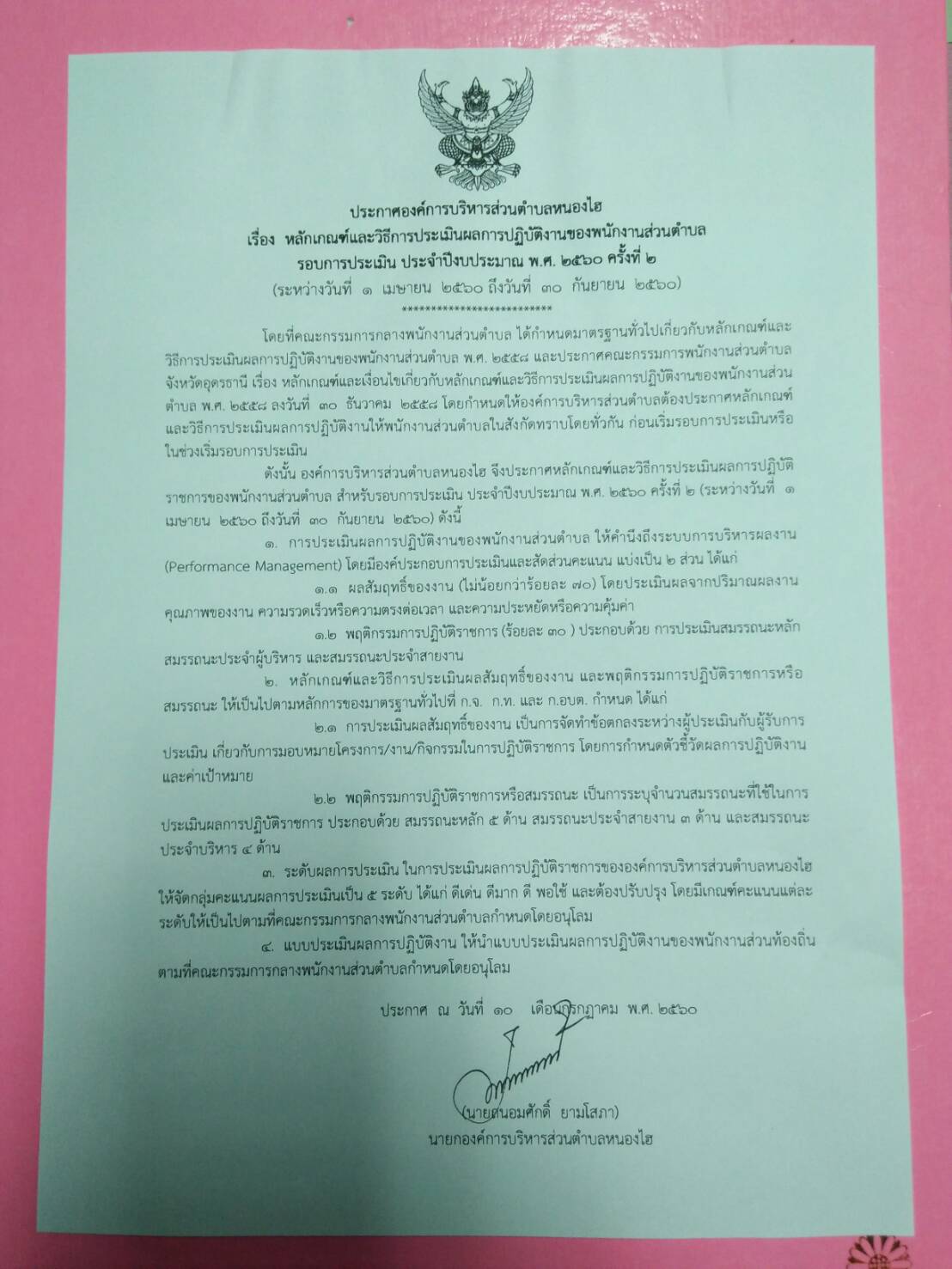 ประกาศ หลักเกณฑ์และวิธีการประเมินผลการปฏิบัติงานของพนักงานส่วนตำบล ประจำปีงบประมาณ 2560 ครั้งที่ 2
