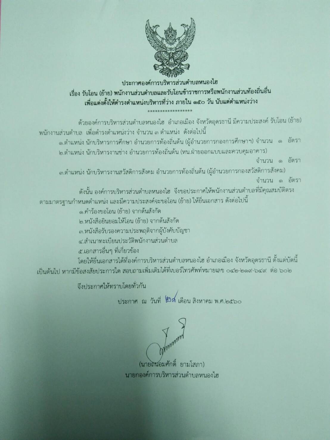 ประกาศ รับโอน (ย้าย) พนักงานส่วนตำบลและรับโอนข้าราชการฯ (28 ส.ค.60)